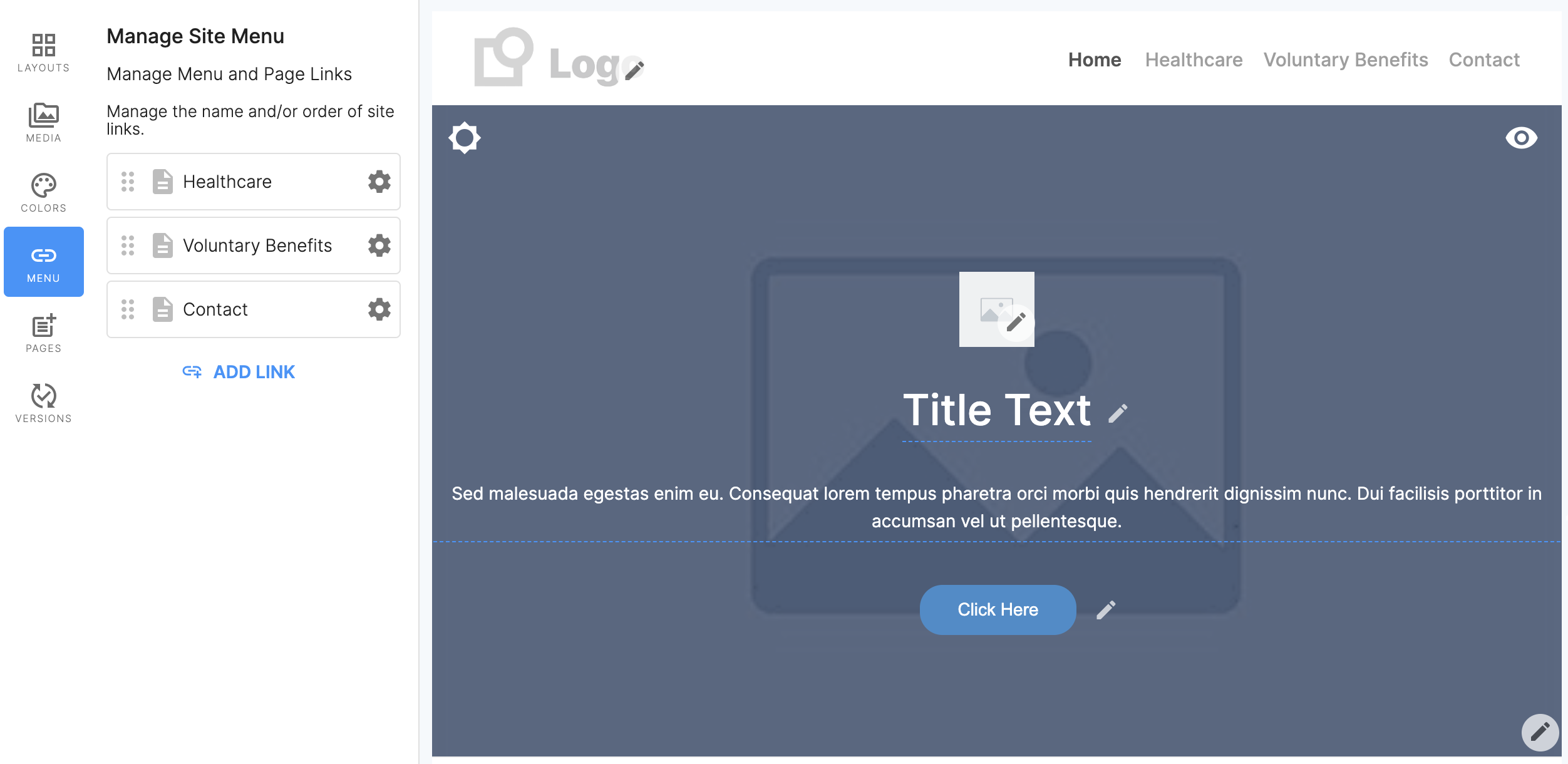 Creating a top navigation menu item that links to an external page or URL can be done by clicking on “Add Link” under the menu on the left-hand side of the editor.